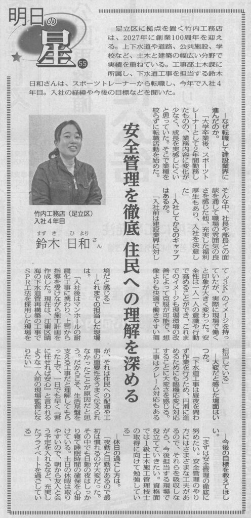 建通新聞(1月26日発刊)の「明日の星」のコーナーに、今年で入社4年目になる鈴木日和さんのインタビュー記事が掲載されました!